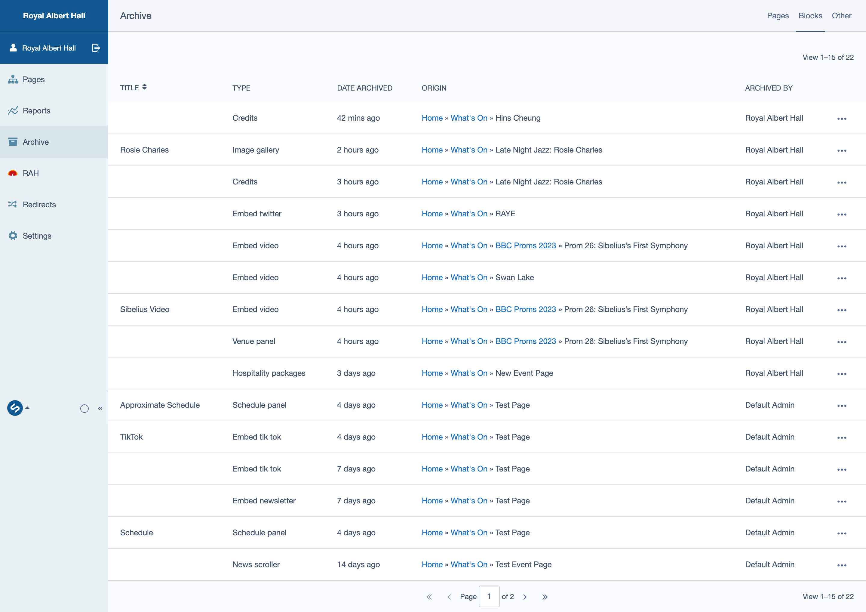 The archive is where all the blocks you have unpublished and archived live. So if you have accidentally archived a block, it will be retrieveable here.